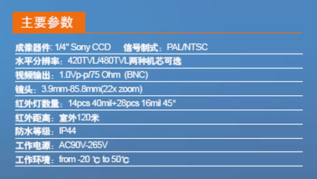 DV-898D2智能多段式变焦变光同步一体化红外摄像机采用1/4"Sony CCD,内置3.9mm~85.8mm(22x zoom)变倍镜头,其嵌装的红外灯室外照射最远距离达120米,能构成三组不同视 角和功率的红外照射范围,可配合大变焦镜头对不同视距的聚焦。该机嵌装14颗40mil台湾鼎元芯片大功率LED,再加上28颗F8LED,使变焦摄像机能够在黑暗中也能清晰地看清远中 近距离的图像。