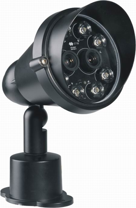 乐荣此次提供一款红外灯照射距离达120m的准专业级红外机RL-H1006A。该机外型极其新颖,横切面呈椭圆形,周身浑圆流畅,材质同样采用压铸铝,内外表面喷涂了一层均匀的银灰色磨砂金属漆。拆开内部,RL-H1006A的灯板由8颗大型杯状LED灯和22颗常规LED灯组成。其摄像机采用单镜头双CCD结构,两枚单板机上的CCD由排线引出,一台马达专门用于控制切换镜头与两枚分别负责日/夜的CCD,使之昼间夜间各使用不同的CCD进行图像采集,提高了画面精度并延长了摄像机使用寿命。再看电源部分,该机使用继电器对红外灯的电源功率进行控制,有效控制了流经红外灯的电流电压,适当延长了红外灯的使用寿命。图像表现方面,RL-H1006A的色彩饱和度稍欠丰满,其他方面均很优秀。总体来说,该机作为120m距离的一款准专业级红外机相对配置较高,这种单镜头双CCD的切换模式也颇为新颖,使机器既能达到黑白切换又能保证红外灯的昼夜图像,实为近年来不可见的创新之作。