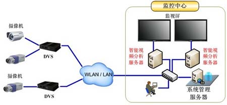 如图1,采用后端服务器视频分析的方式,即前端摄像机DVS将视频编码后(H.264、MPEG4、MJPEG等视频格式),传输到后端的监控中心,由后端监控中心的智能视频分析服务器对各路视频信号来完成智能分析算法运算,并根据各种算法输出分析结果给用户。