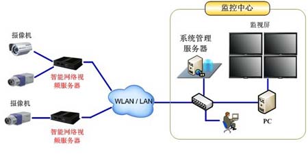 如图2,在监控前端,摄像机直接接入到智能网络视频服务器(模拟信号输入),该服务器是一台DSP嵌入式设备,即在该设备上直接完成智能算法的运算,分析视频图像,并通过网络将视频或分析结果传输到后端的监控平台。