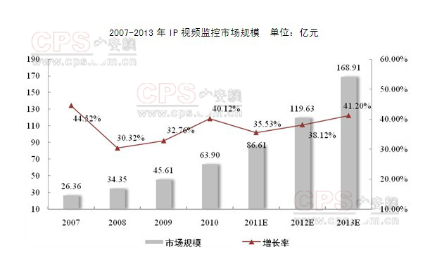 2010年在中国安防市场的总体规模中,安防产品约占43%,安防工程和服务市场约占57%。由此,我们预计,2011-2013年视频监控系统集成工程与服务的市场规模将达到384亿元、461亿元和557亿元,安防视频监控产品市场规模将达到290亿元、348亿元和420亿元。