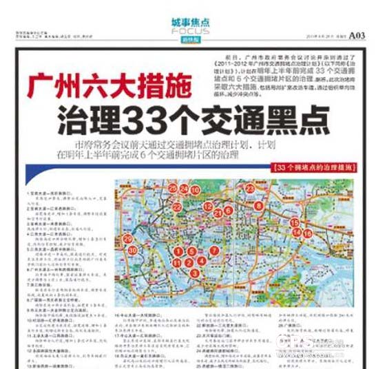 【广州六大措施治理33个交通黑点】近日,广州市政府常务会议原则通过了一项“交通拥堵点治理计划”,计划在明年上半年前完成33个交通拥堵点和6个交通拥堵片区的治理。此次治堵将采取六大措施,包括局部扩宽改造车道,通过组织单向微循环等。