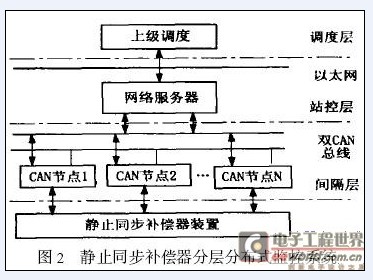 DS80C390片内集成有2个CAN接口模块,可靠性较高,适合用来实现双CAN线分层分布式监控系统。电力系统静止同步补偿器分层分布式监测系统的电路原理框图如图2所示,整个监控系统分为调度层、站控层和间隔层。