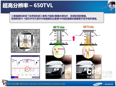 最近一段时间,随着960H的前后端模拟高清解决方案的推出,彻底解决了这种“头重脚轻”的状况,前端摄像机厂家,利用960H高清CCD解决方案的优势最大限度保证了影像的完整性,大量推出650线-700线的模拟高清产品,如三星在2011年也推出数款彩色650线,黑白700线的模拟高清枪式摄像机和半球摄像机产品。而后端的DVR厂家也推出了960H的解决方案,录像的最高清晰度可以达到:960*576,完全可以把700电视线模拟高清摄像机的高清图像进行高清录像和回放,对比传统540线产品,我们简单做一个除法就知道,在清晰度方面可得到700/540=1.3倍,也就是30%以上的提升。