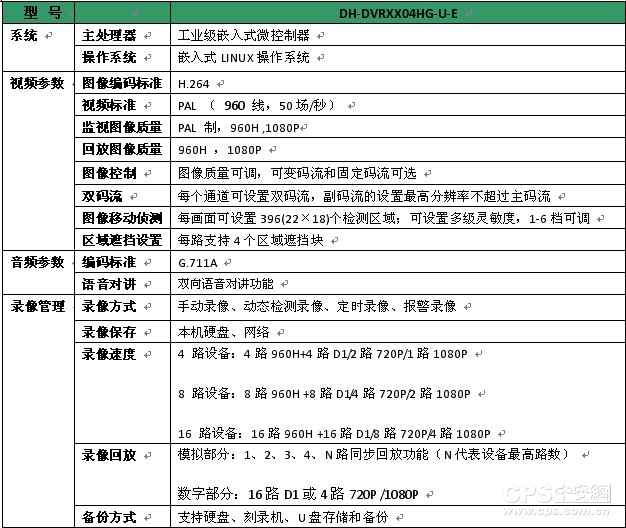 大华DH-DVRXX04 HG-U-E系列960H混合高清数字硬盘录像机是大华自主研发的新一代混合高清数字硬盘录像机,它是集图像处理技术、网络技术、存储技术、智能化技术和结构技术等于一体的高端监控存储设备。它既可作为高清模拟DVR、混合DVR或NVR进行本地独立工作,也可联网组成一个强大的安全防范系统。产品可广泛应用于画质和网络传输要求高,存储时间较长的金融、公安、电力、能源、教育、平安城市等专业安防监控领域。