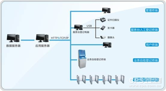 整套系统主要包括数据服务器终端、管理终端、服务台人工登记终端、用户终端、语音自助登记终端、警卫终端、进出闸机通道终端等。