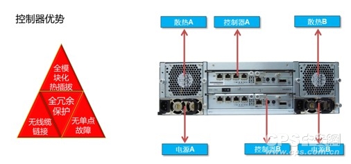 控制器架构,采用专用的数据传输芯片、专用的RAID数据校验芯片、专用的高性能cache缓存和专用的嵌入式系统平台。控制器架构的专业存储,到底具备什么优势呢?我们看实物图来分析可以看出:无单点故障、全冗余配置、内部无线缆连接、并且全部模块化,这样的设计以及实现方式,保证了整机真正的高可用性,改善了服务器架构宕机时间长,有单点故障的问题,今天要介绍的6系列,全部基于控制器架构产品,具备很强的竞争力。