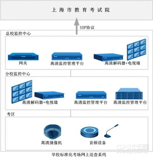 科达作为教育行业多类视频系统解决方案的专业提供商,近年也在标准化考场的建设中初露头角--2012年,包括华东理工、上海交大、同济、华东师范等8所上海知名高校都委托科达建设了标准化考场网上巡查系统,用以开展学校研究生考试、英语等级考试、期末考试等。系统采用考区-分校-总校多级联网架构,考区作为系统的末端部署科达高清摄像机及音频设备,用于开展考试现场的音视频采集、教务室与监控中心即时通讯等工作。各分校和总校分别设立监控中心,部署科达监控管理平台、存储、解码显示等设备,用于实现考试监督与指挥、考试全程录像存储以及突发事件处理等管理工作。此外,这套系统遵循政策规定,均采用SIP协议接入了上海市教育考试院,主管部门可及时高效的对辖区学校考试工作进行监管。