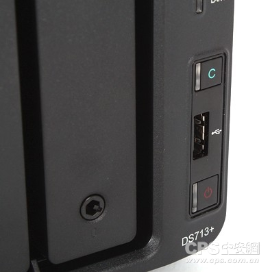 三颗指示灯的下方是两个按键和一个USB 2.0接口。其中,印有字母“C”字样的按键为Copy按钮,与USB接口配合可实现外置存储设备的一键备份功能,最下方的按键则为电源开关按钮。