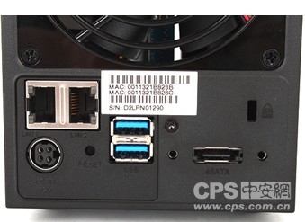 其中,群晖DS713+的双千兆网络接口支持Link Aggregation技术(链路聚合,它将两个物理接口聚合成一个逻辑端口,需要搭配拥有聚合链路功能的交换机使用),可以用作网卡冗余或负载平衡使用。而eSATA接口经过特殊设计,两边的螺丝孔位可牢牢固定eSATA线缆。该接口不仅可以用来接驳用户的外置移动存储设备,还可以用来外接群晖自家的存储扩容设备(Synology DX513和DX213),帮助用户轻松将存储容量扩大至最多28TB。