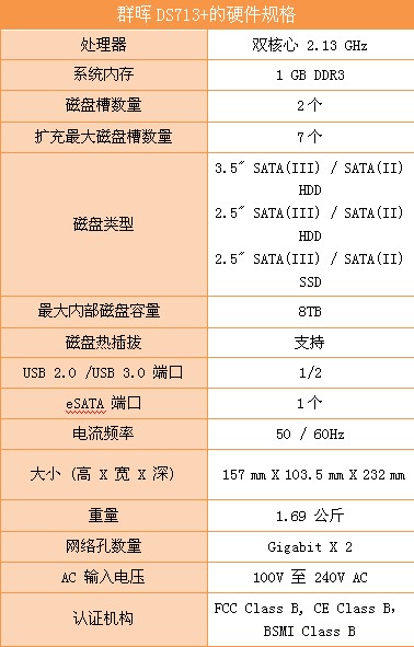 群晖DS713+将CPU由原先的单核1.8GHz升级为双核2.13GH,还加入了最新的USB3.0端口。在双千兆网络接口和Link Aggregation链路聚合功能的帮助下,群晖DS713+能够提供每秒202.3 MB的读取速度和每秒135.84 MB写入速度。存储空间方面,DS713+采用双硬盘位设计,支持8TB储存容量。此外,该机还具备良好的容量扩充性能,可通过Synology DX513轻松扩展至最多7颗硬盘,支持最大28TB储存容量,满足企业快速发展的不同需要。