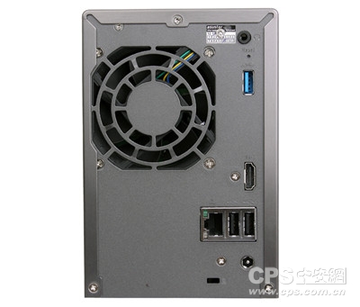 机身背面则是整个NAS最重要的位置了。有一个USB3.0接口、两个USB2.0接口、HDMI接口,3.5mm音源输出接口、前兆网络接口以及电源接口。值得一提的是华芸AS-202TE的散热风扇正对两个硬盘位置,给硬盘散热带来很好的效果。