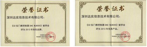 达实公司自主研发生产的32位门禁控制器凭借优异的产品性能,喜获“2013年优质产品奖”、“2013年知名品牌奖”双重奖项。