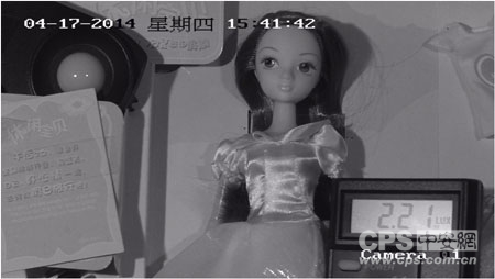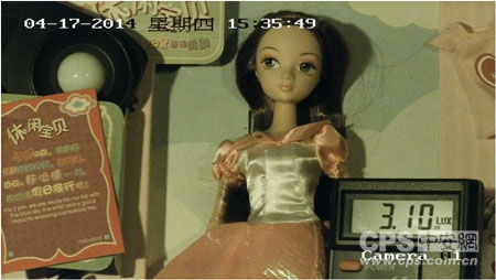 检测1-低照度:将该机置于暗箱中,同时对准暗箱中的布娃娃和照度计,调焦清晰后,小编对暗箱中的灯光亮度进行调节,当照度值为4Lux左右时,画面出现不明显噪声,达到2.5Lux左右时,画面自动切换为黑白显示,此时对焦清晰,几乎无噪点;持续调低亮度,当照度值达到0.01Lux以下时(镜头F=1.4),布娃娃以及照度计显示的数字依然清晰可辨,可见其星光级的监控效果名副其实;
