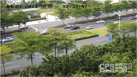 检测1-实景:将摄像机对准室外的道路场景,小编分别在1080P/25fps/4mbps与1080P/50fps/6mbps的参数设置下观察二者的实景表现,发现在高帧率下,街上高速运行的车辆画面更加顺畅,其细节也更丰富,该机在高帧率下表现良好;
