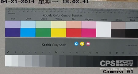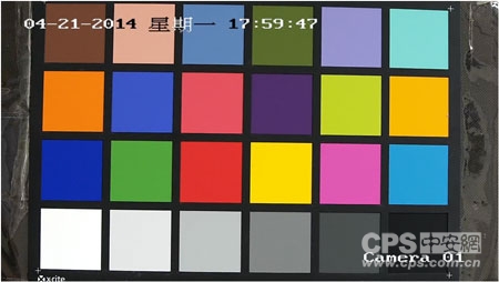 检测3-色彩、灰阶:摄像机对准色彩测试卡,将显示器中的色彩卡与原色彩卡进行比对,除个别颜色偏淡外,其他颜色均还原良好;将色彩测试卡换成灰阶等级测试卡后,18级的灰阶等级清晰可辨,该机的灰阶表现良好;