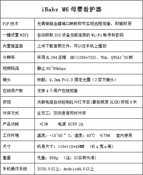 iBaby M6系列已经苹果商店认证,可在苹果商店购买。产品以精美的小雪人外形,全方位的日夜高清看护;加上采用苹果MFi技术,一键式配置安装,使用操作简单。内置摇篮曲,语音对讲通话清晰,无声音串扰现象;支持音频文件上传等等,这些都是产品的卖点。但产品暂时不支持云端存储,只支持最新100条的报警信息查询。