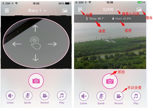100万像素、4.2mm镜头、F2.0固定光圈,支持WiFi这些都是普通监控指标,增加亮点:自动获取IOS设备当前连接的Wi-Fi帐号和密码,双向语音对讲,可在界面PTZ控制,内置摇篮曲,可显示温湿度等信息。