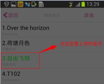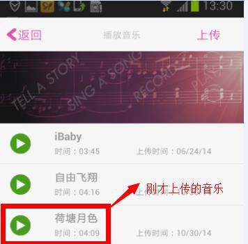 音乐,是上传到您的iBaby账号下,您用其他手机,登录iBaby,也可以看到刚才上传的音乐,另还支持录音存储播放功能。(安卓系统此功能已上线,IOS正在开发)