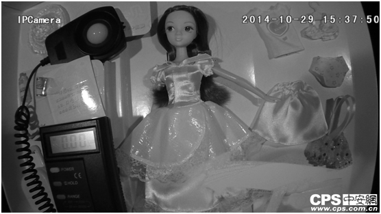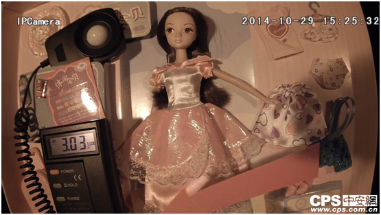 检测1-暗室环境:将置于暗箱的摄像机(F=1.4,降噪开至最大)对准布娃娃及照度计,摇摆件则位于布娃娃前方,调低暗箱灯光之亮度,在照度值由17.52Lux降至6.08Lux的过程中,除却降噪开启所导致摇摆件边缘出现轻微模糊外,其他几乎无改变,画面清晰且色彩准确;0.91Lux时,画面出现轻微色衰,摇摆件亦稍有拖影,但清晰度颇高,画面的细节完整丰富,娃娃边上的文字清晰可辨;0.86Lux时,该机切换成黑白模式,切换后的画面亮度适宜,娃娃五官清晰,发丝细节栩栩如生;照度计显示为0.00Lux时(实际照度在0.005Lux以下),此时与开始黑白切换时的画面比较,除却亮度稍减外,其他表现几乎无别;此外彩色模式下,该机在照度值为0.005Lux以下时依然具备可用性,其星光级超低照度性能名副其实。