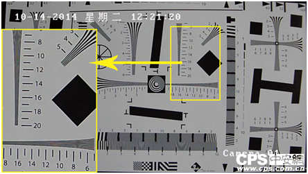 检测1-清晰度:将摄像机在最低变倍下对准清晰度测试卡,发现水平清晰度达到1100TVL,垂直清晰度达到1050TVL,边缘清晰度则为900TVL,画面效果不错;
