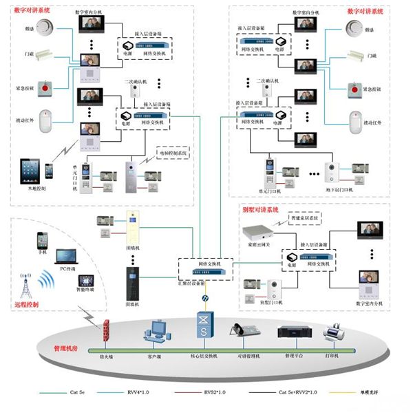 通过可视对讲系统,实现访客、住户、管理人员之间便捷的呼叫通话及实时高清的视频画面;实现管理中心与住户双向通话以及管理中心对指定用户的信息发布,在物管与业主之间建立了良好的沟通渠道,方便物管费缴纳提醒等工作。实现住户与住户之间双向可视对讲,促进了邻里沟通,打造现代化社区的和谐环境。住户还可通过室内机监视功能随时查看门口机、围墙机前的监视图像,以及查看通过授权能监视社区内其他公共区域的网络摄像机的图像。并且通过可视对讲室内机接入报警探测器实现报警功能。