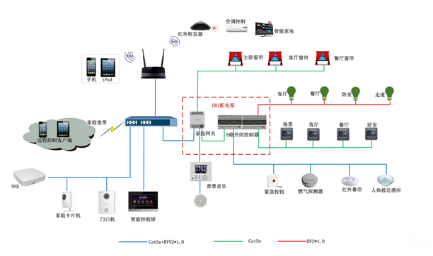 采用社区联网型智能家居构架,可视对讲室内机可当家庭网关用,也可以用独立的家庭网关进行通讯交换。实现灯光控制、窗帘控制、可视对讲、门禁控制、家庭报警控制、家庭多媒体等功能。通过“E”生活服务端,可以接收管理中心设立专属的信息发布,实现高档物业的VIP服务,如健身美容SPA的预定、叫车、洗衣、点餐、快递、急救,还可以呼叫物业进行物业服务等。通过移动终端可远程完成对智能家居设备控制,比如远程开启空调地暖。还可远程查看家中设备的情况。