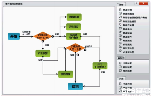 时间点出发,可以按天,也可以具体到时分秒,当时间条件满足后,系统自动执行工作流。例如对于学校周界报警,由于白天误报太高,早8点全部撤防,晚7点全部布防,计划工作流就可以轻松实现,在提高工作效率的同时,也避免了保安人员工作疏漏。