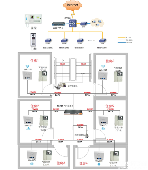 采用TG云盒子对智能楼宇网络进行集中智能化管理,TG云盒子是一款集设备管理、POE供电管理、智能无线、网络诊断、网络监控于一身的综合网络产品。可对网络中的交换机、路由器、AP等集中下发配置、一键批量升级、一键批量重启。可智能生成网络拓扑,通过拓扑可直观看到设备、端口运行情况,链路故障信息。图形化数据统计,实时观察流量。可一键诊断出内网设备配置隐患、流量异常、内网攻击、运行风险等。