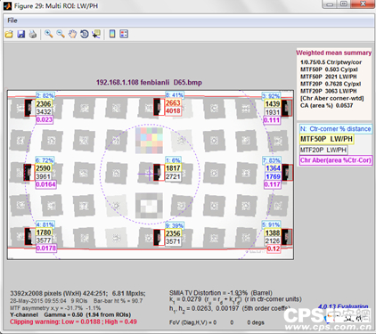 将DH-ITC602固定好后对准ISO12233测试卡,通过观察监视器发现该摄像机的水平与垂直清晰度都能接近1800TVL,边缘清晰度已经超过1000TVL,截图通过软件分析得出该摄像机的MTF50P为1683,如图1所示。随后换上SFRplus测试卡,通过观察发现该摄像机提供的解析度中心和边缘差别不大,整体清晰度均匀,经过软件分析得出的加权值达到2021,相比同类产品要优秀,如下图所示