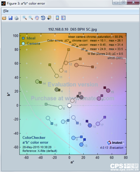 由于该摄像机可提供车身颜色识别,所以我们也对摄像机的色彩还原进行了测试。通过在D65标准光源下抓拍24色彩还原卡图像,并通过专业软件分析,得出该摄像机的饱和度:85.7%;C=7.4;E=23.6。测试结果为图像颜色偏淡,色块3色彩还原接近于理想颜色,在色块7、12、16颜色彩偏差较大,如下图所示。