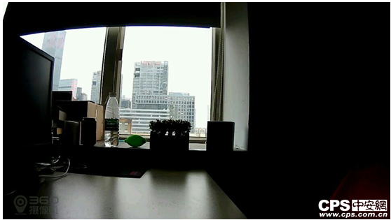 将摄像机置于窗口进行拍摄,室内外照度差约为22000:700,暗区亮度很低,无法辨认物体,摄像机动态范围表现稍差。360小水滴摆放不宜对着窗口、门口。