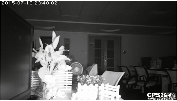 摄像机红外开启之后,切换成夜间模式,画面转换成黑白模式,整体画面轻微朦胧,噪点较小。夜视效果总体表现良好。