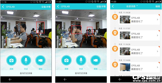 如上图,当监护画面有较大异常移动的时候,手机APP提示画面异常,当细小变化时,没产生异常推送。经过多次测试,设备异常推送准确,能够屏蔽光线影响,小动物等误报因素。通过异常提示截图,可以查看异常画面。