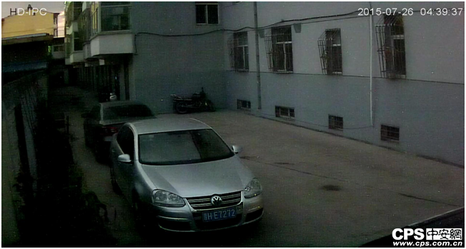 图7 同样凌晨04:27,同样地方,摄像头是大华130W红外补光的IPC,可以看到近处的两辆车,但是车牌反光,看不清车牌号,对比图6的迈视微光摄像机的一片漆黑,效果还算是能接受。