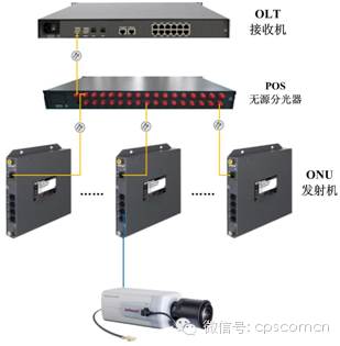 ONTS由发射机、无源分光器和接收机组成,在楼宇小区中应用时,可采用星型组网,架构非常简单。可在每层楼放置若干个发射机。网络摄像机依据就近原则,使用网线连接到附近发射机的百兆以太网口;所有发射机都使用光纤汇聚到无源分光器;无源分光器的上行光口通过光纤与接收机的下行光口相连。ONTS为楼宇小区提供先进、可靠、高性价比的网络视频传输交换专网。