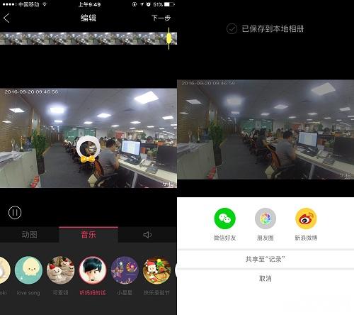 在录制完视频后,小Q还有编辑视频的功能,各位宝爸宝妈可以对视频添加贴图、音乐等特效,随后就可以保存到相册,或是即是发布到社交网站。