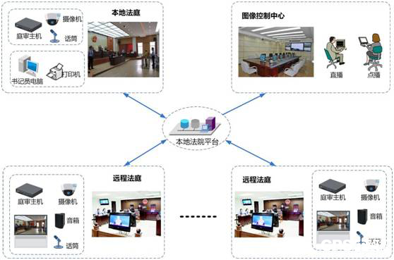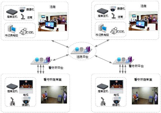 远程庭审功能实现公诉人在本地、犯罪分子在远程时进行庭审,并进行同步刻录,避免路途上的奔波,提高办案效率。远程庭审系统是利用法院专用IP传输网络,以各法庭为中心,设立远程数字庭审中心,配置远程庭审终端、专用摄像机和麦克风,实现图像传输和远程通信。审判人员可以在远端对犯罪分子进行远程庭审,此方式一般用于法院提审看守所犯罪分子或者上级法院提审下级所属的犯罪分子的情况。实现对远程被审对象的实时庭审。