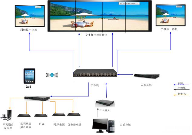 ●对所有信号源进行统一调度管理,同时对音频处理器、视频会议终端、矩阵、时序电源、强电继电器等进行统一控制管理。