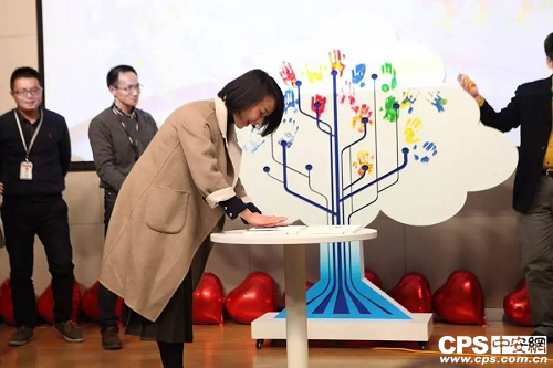 图为:海康威视员工代表在企业文化树上摁下自己的手印,缤纷的色彩也昭示着海康威视的未来将会更加多姿多彩