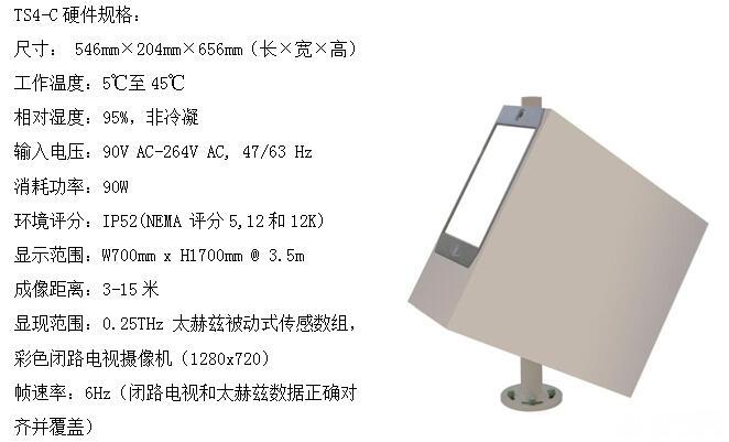 同时,该设备还具有高频率的特色。据介绍,高频率太赫兹技术是目前国际上少数几家公司掌握的技术。采用该技术的设备具有体积小巧、重量轻等特点,其大小仅相当于一个台式电脑机箱。为此,该款设备在部署时,极易安装,既可以落地使用,也可以悬挂于墙壁、天花板处,或安装在小推车上移动使用。
