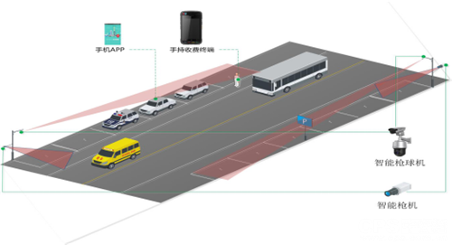 伴随着室外视频车位检测器产品的发布,枪球联动的方案目前也是另一个热门的方案,系统前端设备主要由: 车位管理枪球机、车位管理枪机、LED常亮补光灯,管理终端(选配)和智能手持终端,车位管理枪球机、车位管理枪机架设于路内停车点的一侧,用于停车点停车状态检测以及车辆抓拍;LED常亮补光灯用于夜间环境光照度较低时枪球机的补光,采用暖光灯,降低光污染;交换机用于前端网络设备的汇聚;终端服务器用于前端数据缓存;智能手持POS辅助收费工作,用于泊位状态以及车辆信息核准、收费管理等。
