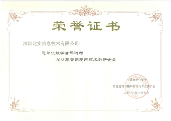 达实再度荣获“2018年智能建筑技术创新企业”称号