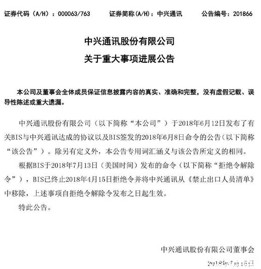 摘要 7月16日午间消息,中兴通讯近日发布公告称,美国商务部工业安全局(BIS)已终止2018年4月15日拒绝令,并将中兴通讯从《禁止出口人员清单》中移除。