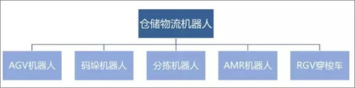 根据应用场景的不同,仓储物流机器人可分为AGV机器人、码垛机器人、分拣机器人、AMR机器人、RGV穿梭车五大类: