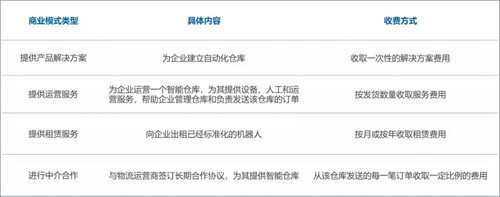 提供运营服务的模式:指为企业运营一个智能仓库,由仓储物流机器人厂商提供设备、人员和运营服务,帮助企业管理仓库和负责发送到该仓库的订单。仓储物流机器人厂商负责仓库的日常运营并将按照仓库的发货数量收取一定的服务费用。