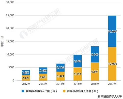汽车工业、3C电子、烟草行业、物流行业是移动机器人应用最为广泛的几个行业,市场前景广阔。据前瞻产业研究院发布的《中国互联网+机器人行业市场需求预测与投资战略规划分析报告》统计数据显示,截止至2017年,我国移动机器人产量为12090台,占工业机器人比重9.2%。而国产移动机器人需求量快速增长,2017年我国移动机器人销量达到了12900台,同比增加87.2%。这进一步刺激了移动机器人的进口和海外需求。