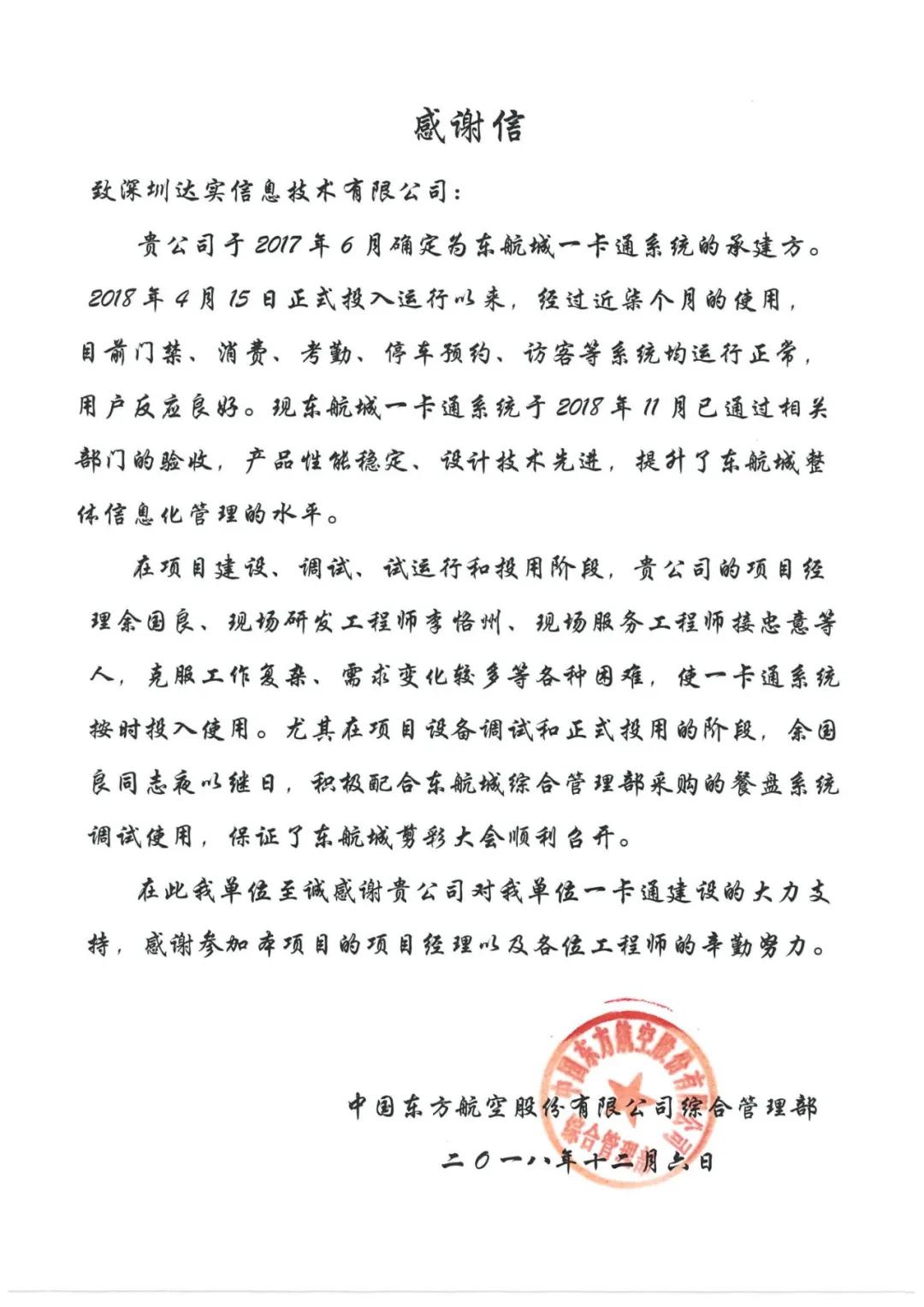 C3物联网身份认证系统已在东航企业稳定运行超过5年,期间不断增补新产品、服务蔓延至全国各基地,经受着11万东航人对我们的检验。从员工上下班的日常工作生活,到福利政策的便利实施,系统已获得来自东航员工的好评。早在18年我们就已经收到了来自东航企业的感谢信,这封感谢信也是对达实物联20余年开发经验的肯定。